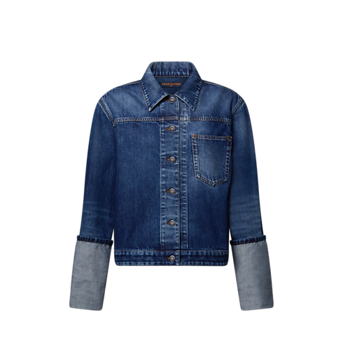 遊び心のあるプロポーションが、現代的な印象を添えるデニムジャケット。定番のロウブルーデニムで仕立てられ、コントラストを効かせたイエローのトップステッチが、胸元のパッチポケットをはじめとする構築的なディテールを際立たせます。袖口には大ぶりの折り返しカフをあしらい、ウエストバンドには今シーズンならではのシックな「Louis Vuitton」のレザーパッチを配しました。