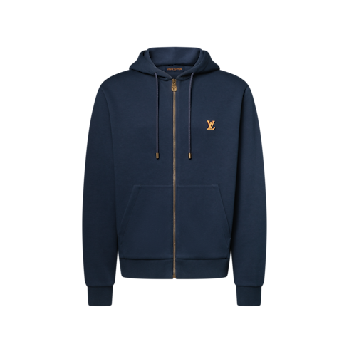 ワードローブに欠かせないタイムレスなネイビーブルーのファスナー付きフーディ。カジュアルな装いにスマートなアクセントを添えます。胸元にはメゾンのレザーグッズの伝統を想起させるヌメ革風のLV シグネチャーをあしらい、レッドの縁取りとイエローのサドルステッチを添えました。ドローストリングのストッパーとファスナーにエイジング加工を施したゴールドカラーの金具を配し、洗練された仕上がりに。