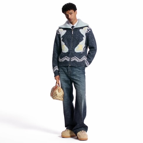 手編みのような質感のあるダークブルーのコットン&ウールのニットブルゾン。2025秋冬コレクションでのファレル・ウイリアムスとNIGO®のコラボレーションから生まれたモチーフがインターシャと刺繍であしらわれ、後者の日本のルーツを想起させます。前面にはLV シグネチャー入りの2匹の鯉を、背面にはサクラ・チェリーブロッサムと日本語のシグネチャーのレタリングを配しました。パール風の装飾を施したファスナー引き手がリラックスした装いにシックな印象をプラス。