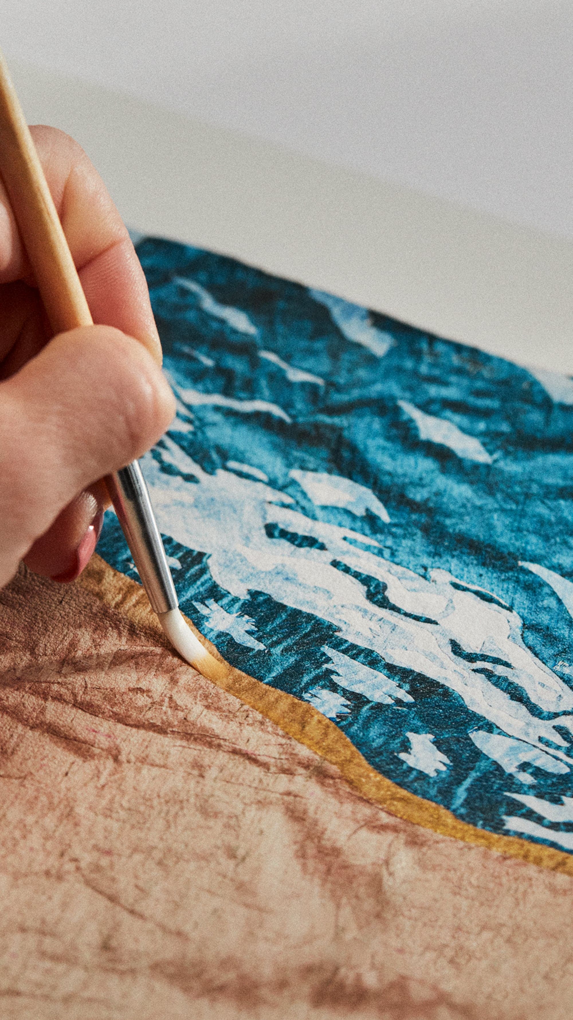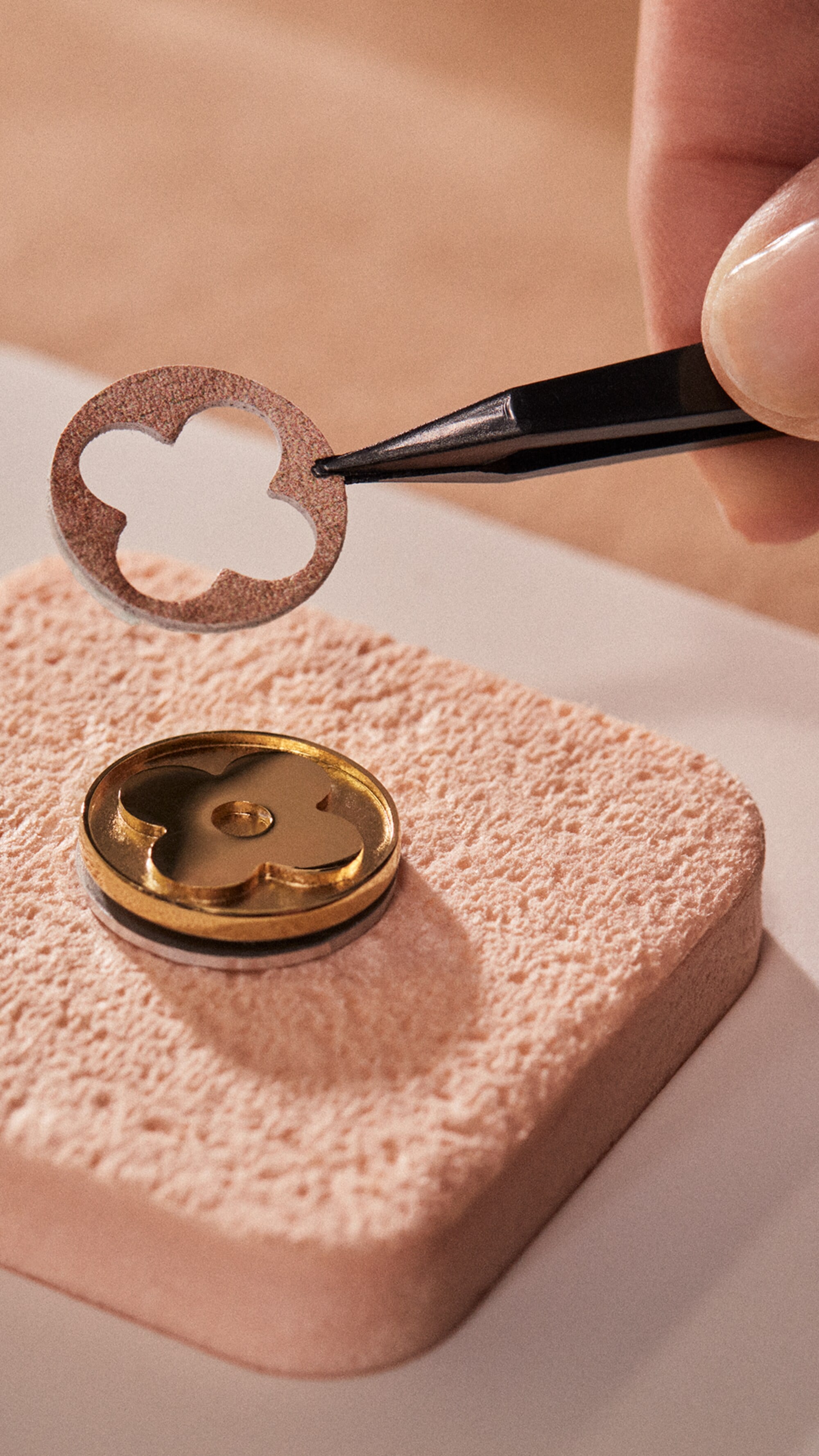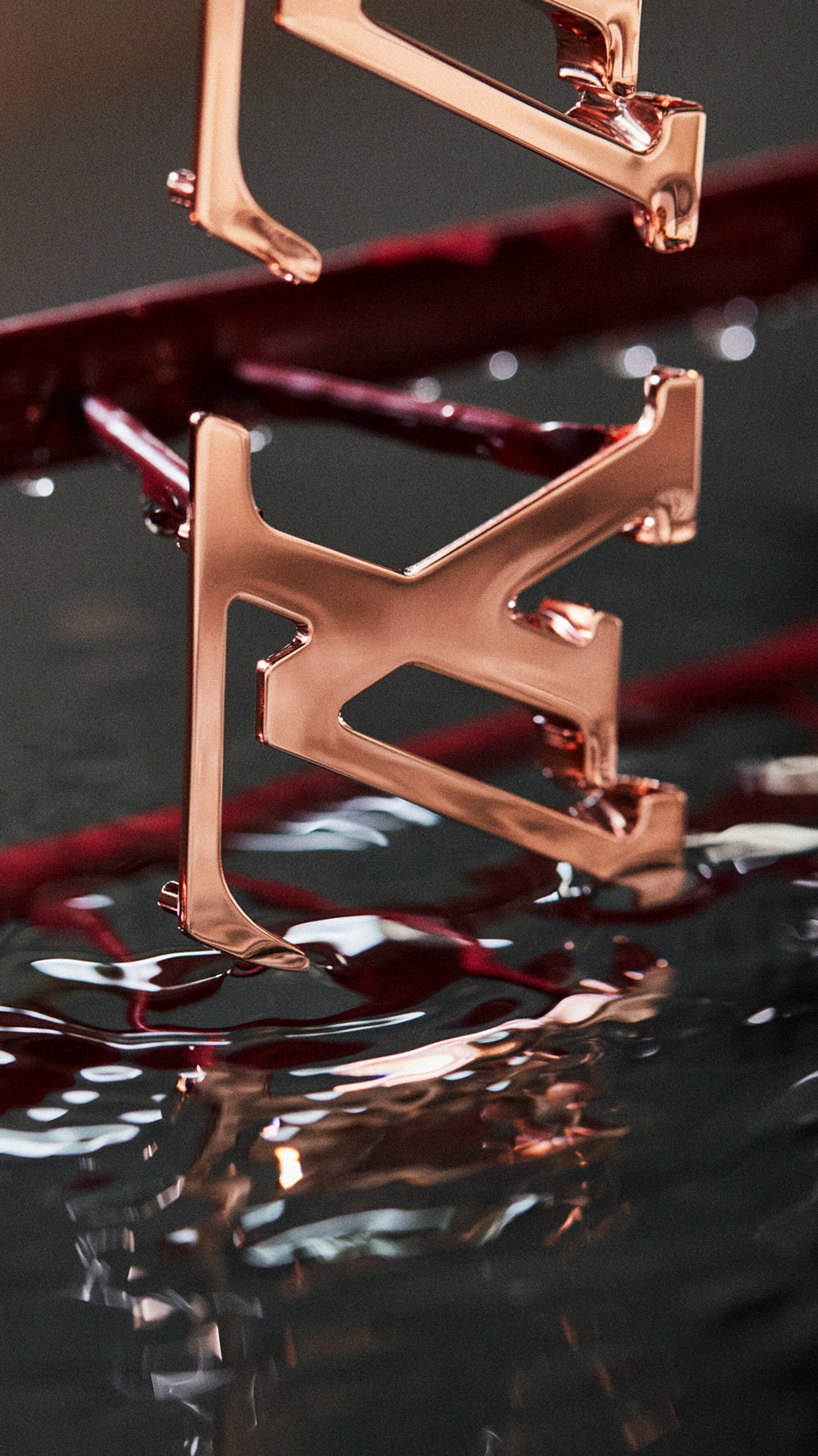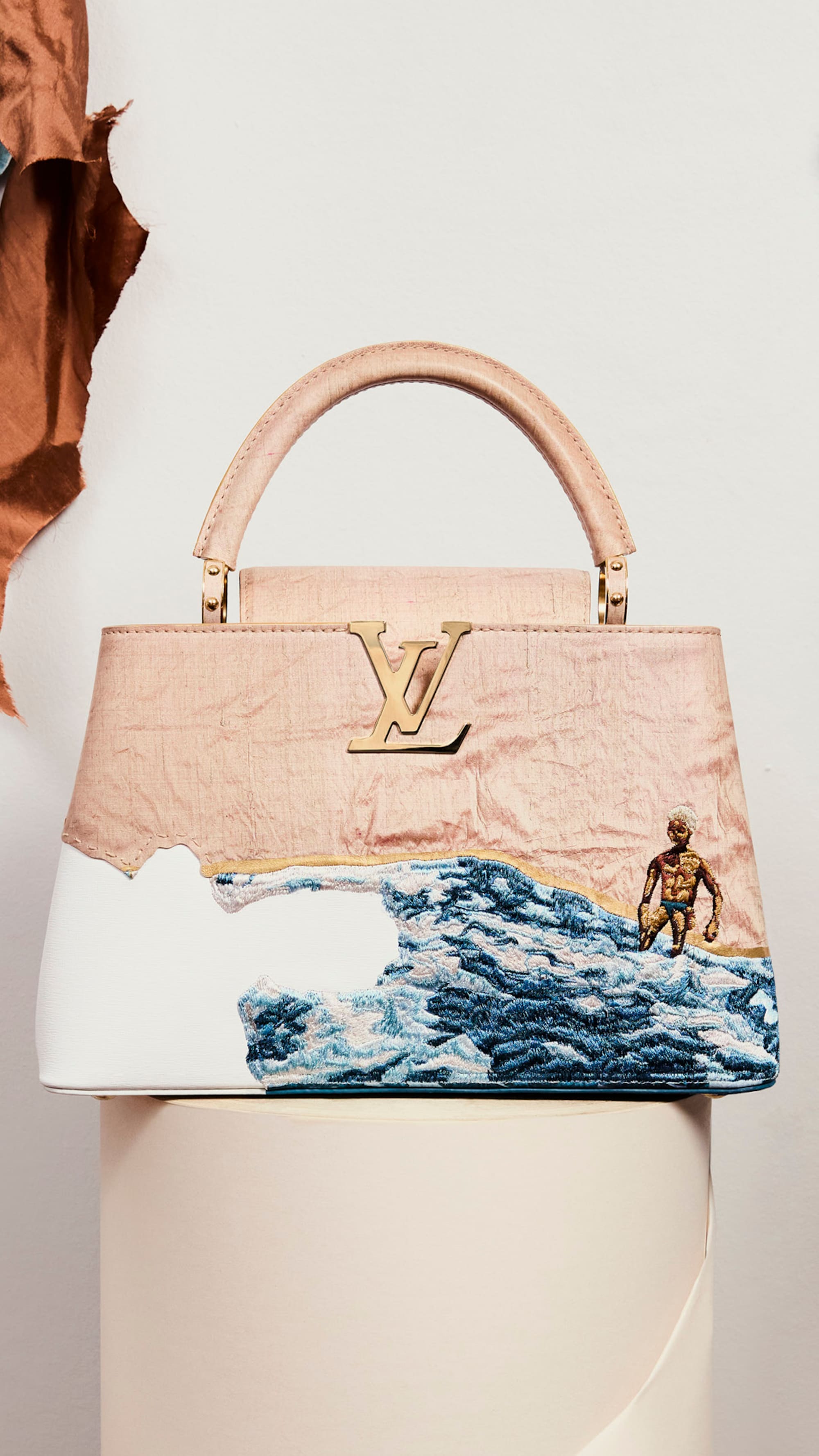 アートとファッションの融合として、スキャンされたザンゲワによるブロンズのシルク・パッチワークの原作は、自然なしわを湛えたソフトなレザーに高精細プリントで転写され、意図的に目立たせたハンドステッチで「カプシーヌ」に取付けられています。彼女の作品に繰り返し登場するテーマであるゴールドのディテールは、プールの縁に沿って描かれ、バッグ上部の縁に施されたメタルのLV シグネチャーまで続いています。「私は、テクスチャーや手触りが好きなので、自らの作品にファブリックを取入れることは必然的でした」──ビリー・ザンゲワ