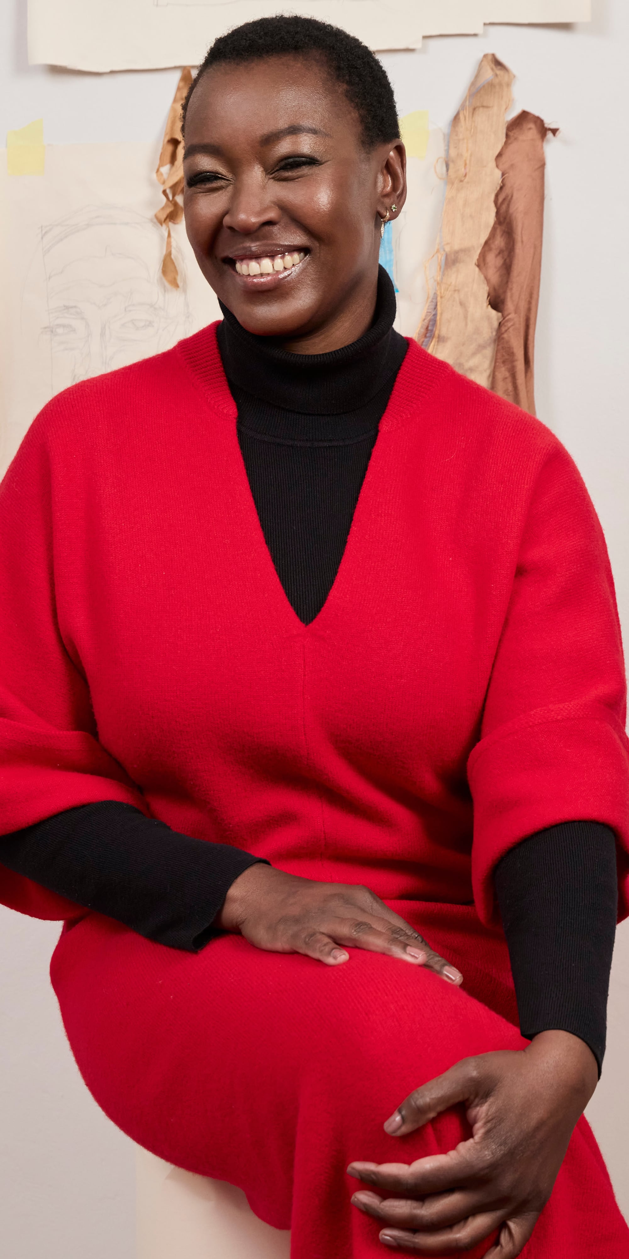 南アフリカを拠点に活動するマラウイ出身のアーティスト ビリー・ザンゲワは、ローシルク片を並べて縫い合わせるアッサンブラージュを通して、社会経済状況におけるジェンダー、アイデンティティ、人種の融合を讃えます。