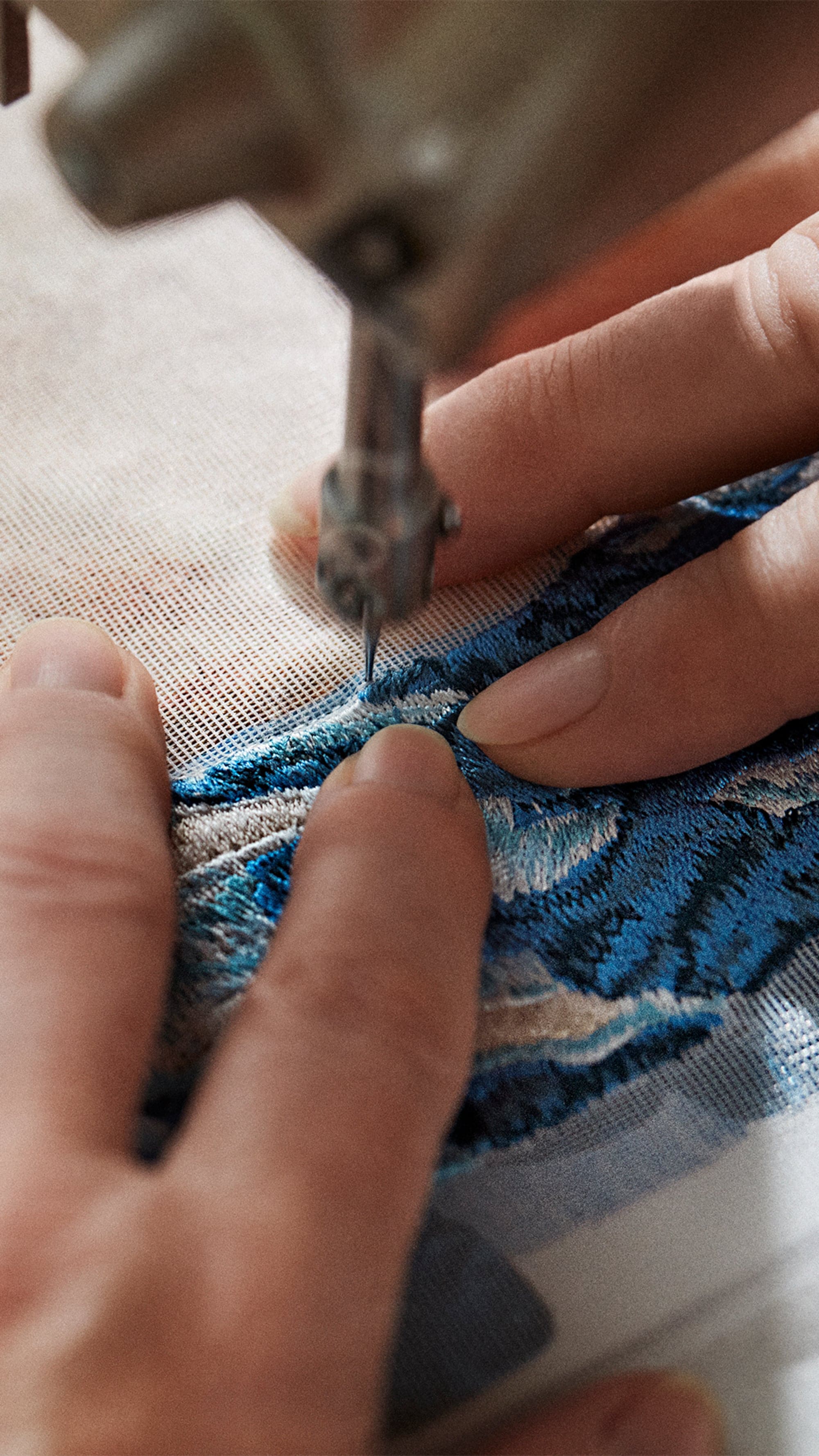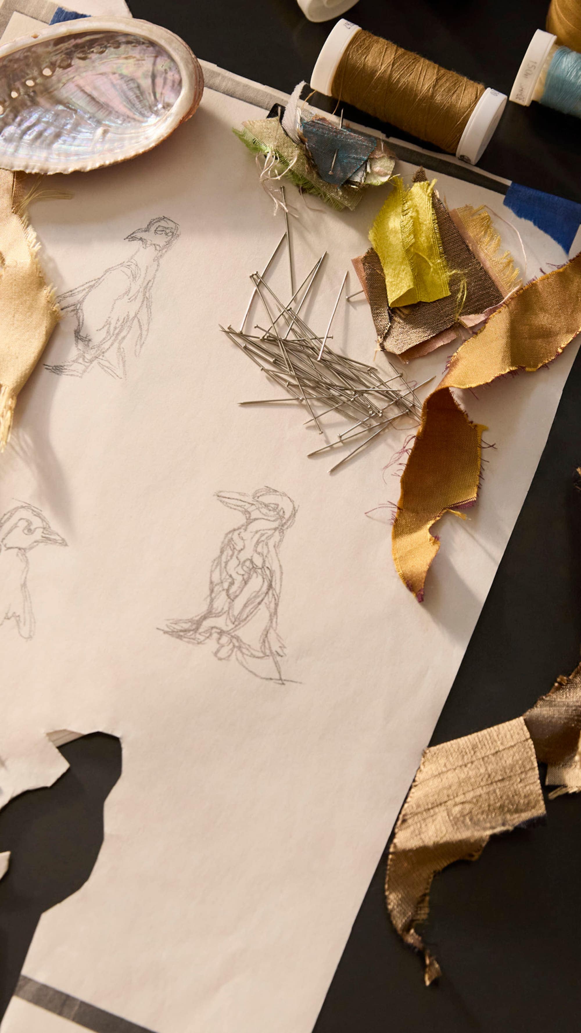 2020年の作品≪The Swimming Lesson≫が落とし込まれた、ザンゲワの「アーティーカプシーヌ」には、煌めくプールの縁に佇む息子ミカの姿が描かれ、手縫いのビーズとメタリックな糸を用いて光の反射を表現。さらに、モノグラムをあしらった3つのペンギンのチャームは2人の永遠の絆を讃えています。