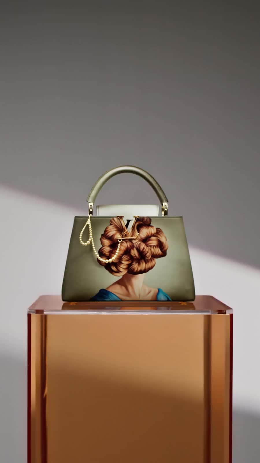 スムースレザーに手作業でペイントされたグリーンのグラデーションの背景は、ディテールまで超高精細に捉える3D デジタルプリント技術を用いて、鮮やかな肖像画を忠実に再現しています。同様にその技術は、アイコニックなLV シグネチャーをカモフラージュするためにも採用されています。「バッグには私の絵のエッセンスや個性を反映させたいと思っていました。手染めのレザーや多層プリントなど、さまざまな技法や素材を組み合わせることは、最終的に美しく洗練された効果を生み出しました」──エヴァ・ユシュケヴィッチ