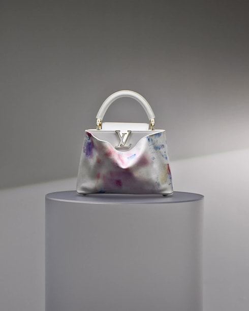 彼女のシグネチャーであるビーズワークを彷彿させる浮き出し模様を施した、ソフトレザーで覆われたライザ・ルーの立体的なバッグ「カプシーヌ」は、彼女の代表的な絵画≪The Clouds≫を想わせるパステルカラーのプリントがあしらわれています。その繊細な質感は、「カプシーヌ」のスムースレザーとコントラストを成すレイヤーを形成し、アイコニックなLV ロゴのクラスプの完璧なフレームとなります。