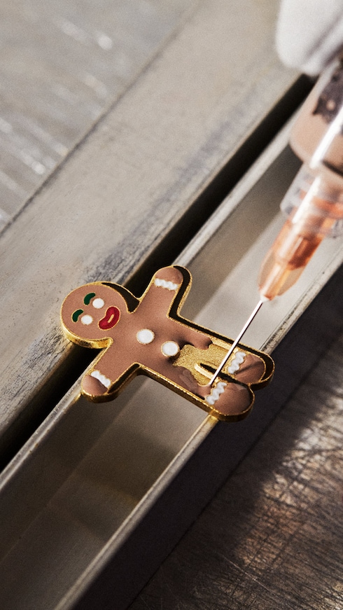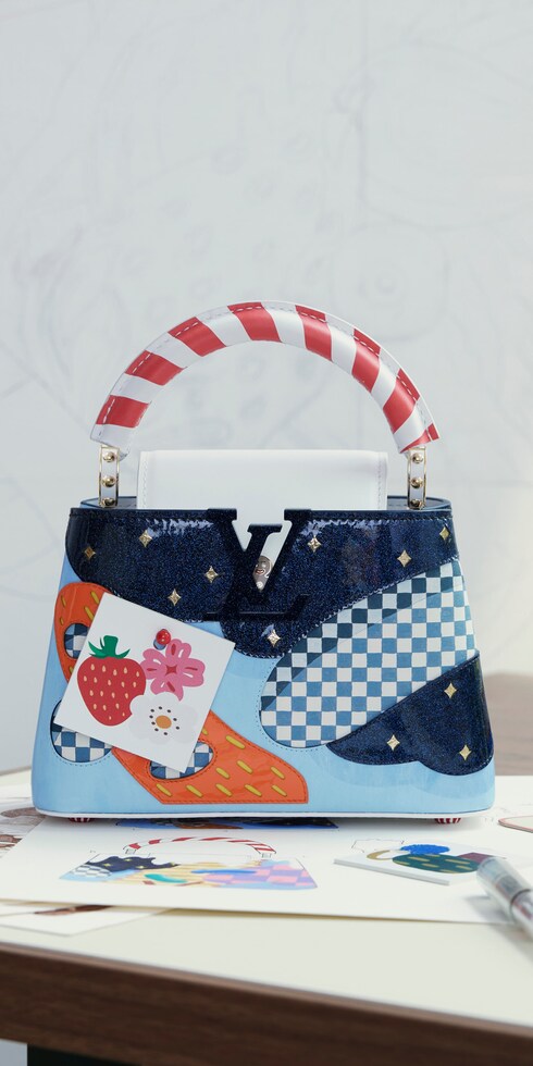 ワイルドに装飾された「カプシーヌ」のなめらかなボディは、鮮やかなテクスチャーと色彩のパッチワーク装飾を施した、煌めくミッドナイトブルーのパテントレザーで覆われ、キャンディケインを連想させるハンドルで仕上げ、アイコニックなバッグをスイーツへと昇華させました。「ミントキャンディを模ったレジン製の底鋲、モノグラム・フラワーのボタンをあしらったエナメル製のジンジャーブレッドマンなど、このバッグで実現されたディテールのレベルには非常に感動しました」──ジピン・ワン