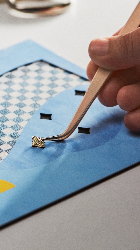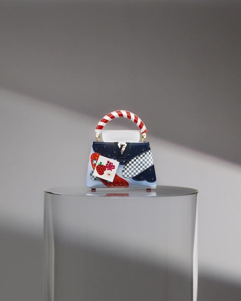 万華鏡のようなレンズを通してメゾンのコードを遊び心たっぷりに再解釈したワンによるミニサイズの「カプシーヌ」は、「アーティーカプシーヌ」の中で最も小さく、アイコニックな「ダミエ」を想わせるグラフィカルなモチーフとエナメルの装飾が施されています。キャンディの包み紙やスイーツを彷彿させる幻想的なクリエーションです。