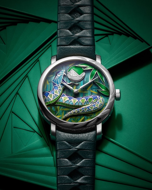 建築的なマスターピースであるこの先見性に溢れたクリエーションは、独特の透明感を湛えた類い稀なダイアルが光を取込み、輝かせます。印象的なステンドグラス風の効果を捉えた緻密なプリカジュールエナメルのダイアルからは、ジュネーブ・シールの刻印があしらわれたスケルトンムーブメントが覗きます。