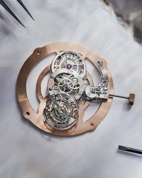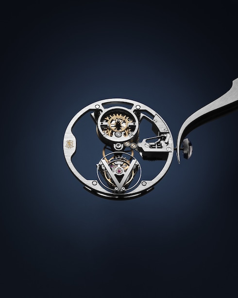 世界的に著名な建築家 フランク・ゲーリーとの特別なコラボレーションによって命が吹き込まれた唯一無二のタイムピースは、ウォッチメイキングアトリエ「ラ・ファブリク・デュ・タン ルイ・ヴィトン」がこれまでに製作した中で最も複雑なデザインのダイヤルとなっています。ダイアルの製作には250時間以上もの時間を要し、完全な透明感を表現。フランク・ゲーリーが手掛ける精巧な建築物を想わせる表情豊かなガラス構造の中で、ジュネーブ・シールが刻印された宝石箱のようなフライング トゥールビヨン・キャリバーが際立ちます。