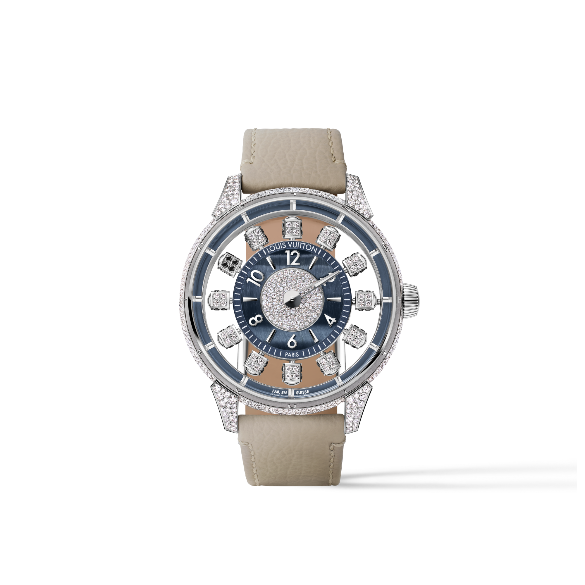タイムレスなハイウォッチメイキングの伝統と現代的な革新性を融合して誕生した3つの「スピン・タイム」ムーブメントは、サンドブラスト加工の施されたブリッジやペルラージュ仕上げが施された地板、無色透明の宝石、そして18Kピンクゴールド製のローターを装備。45時間のパワーリザーブを備えたこれらのムーブメントは、ウォッチメイキングアトリエ「ラ・ファブリク・デュ・タン ルイ・ヴィトン」の比類ない精密さとアヴァンギャルドなクラフツマンシップへのこだわりを表現しています。