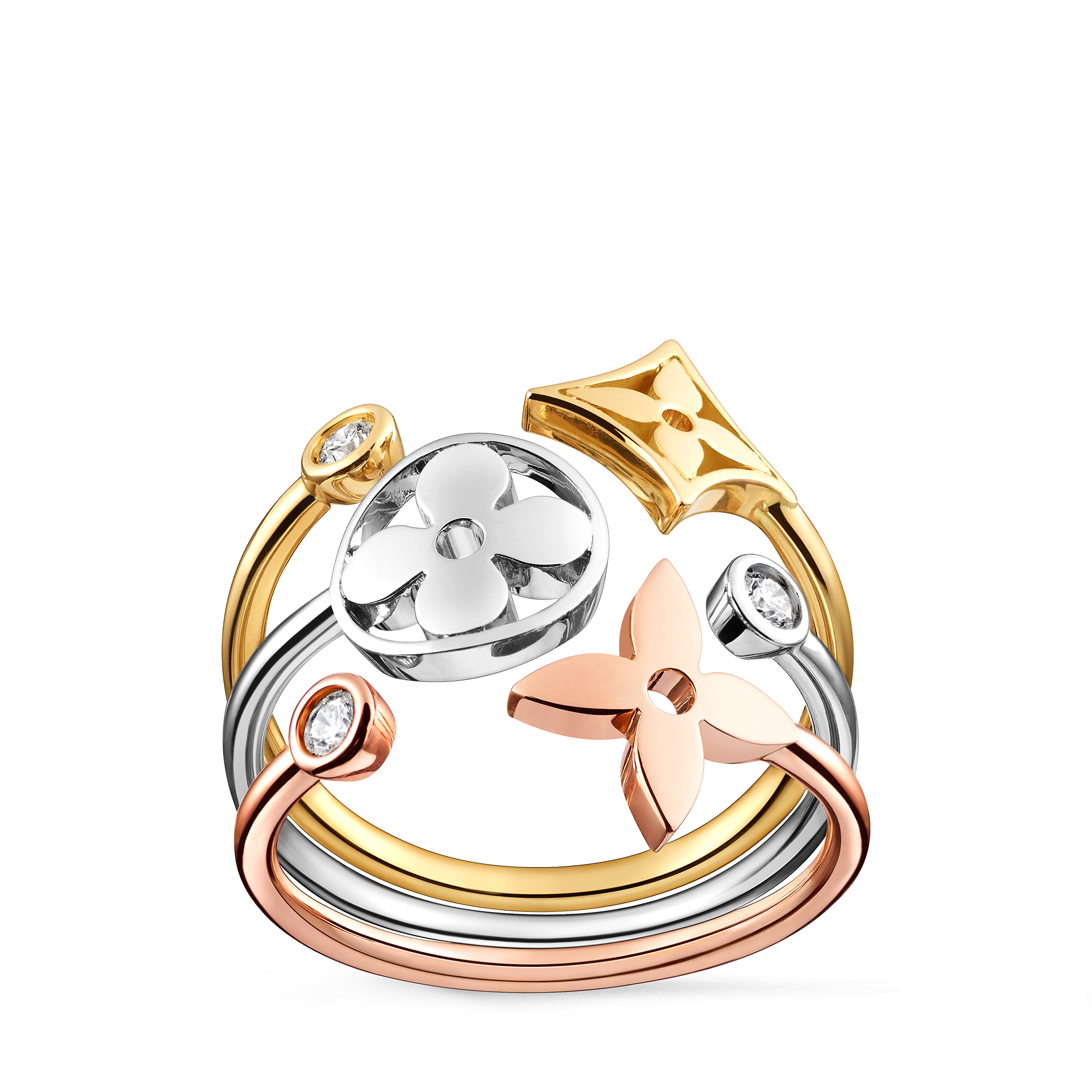 ルイ・ヴィトン「イディール ブロッサム」コレクションは、ピンクゴールドやイエローゴールド、ホワイトゴールドに輝くダイヤモンドをあしらったスタイリッシュなバリエーションを展開。メゾンのシグネチャーに命が吹き込まれたこれらの繊細なクリエーションは、単体や重ね着けでも楽しめます。