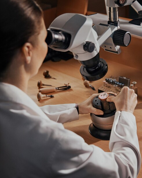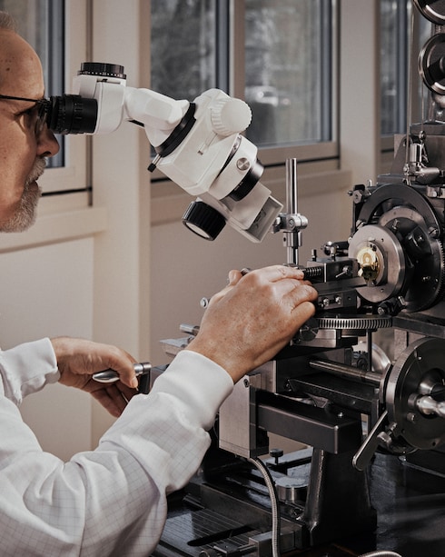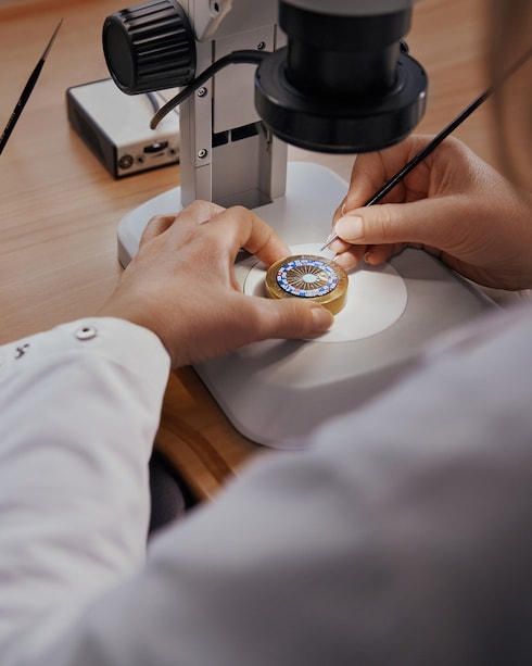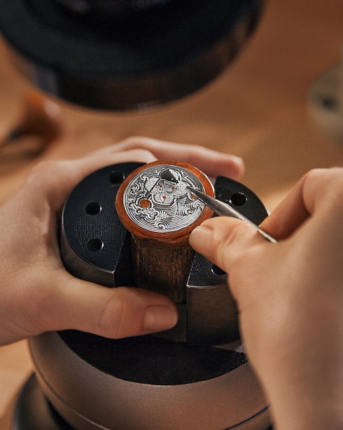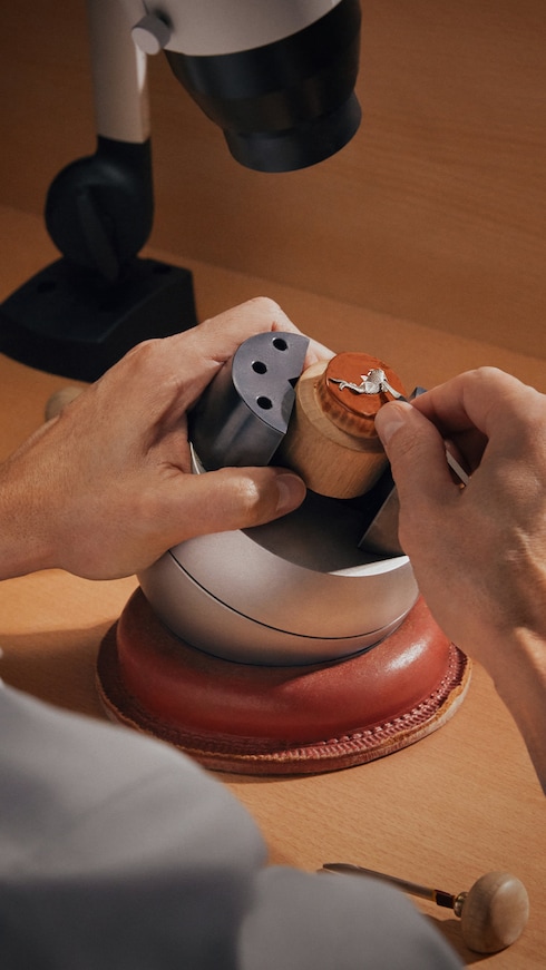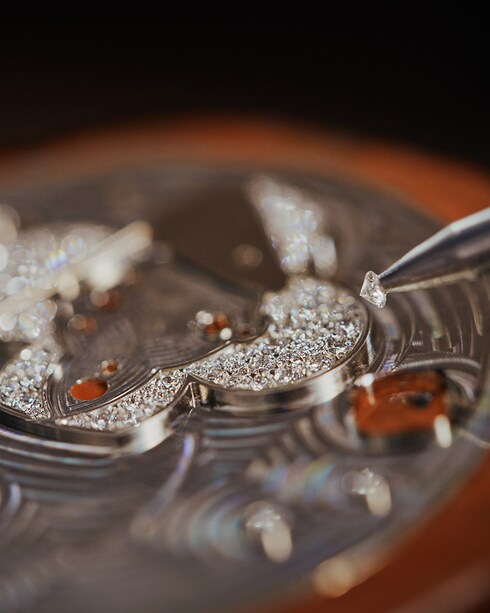 ベゼルやケース、ダイアルに燦然としたきらめきを添える宝石のセッティングは、アトリエのクリエーションにプレシャスなタッチを添えます。宝石をセットするため、まずはマスター・ジュエラーが金属を精巧に加工。その後、マスター・ジェムセッターがクローズドセッティングやプロングセッティング、スノーセッティングなどの洗練された技法を駆使し、細心の注意と芸術性を持って宝石をセッティングすることで、詩的な仕上がりに。