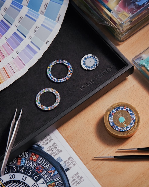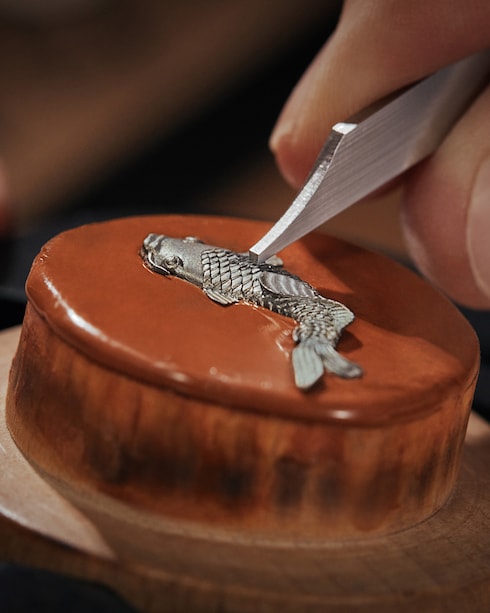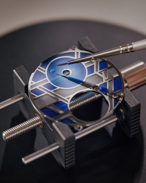 エナメルと焼成時の熱との出逢いによって色の輝きと力強さが際立つ、エナメル加工。「ラ・ファブリク・デュ・タン ルイ・ヴィトン」の熟練したエナメル職人が数年を掛けて習得する卓越した専門技術を要する極めて高度なアート技法です。これらの技法には、クロワゾネ(有線七宝)と同様に、金属線が透明感とコントラストを際立たせるプリカジュールエナメルや、装飾用の金箔を切り抜いた細密モチーフを半透明のエナメルで覆うパイヨンなどがあります。