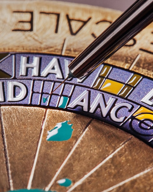 並外れた専門技術と精度を示すミニチュアハンドペインティング。太さ10分の1ミリにも満たない1本の毛でできた絵筆を用いてダイアルの細密な情景を確かな技巧で描き、際立たせます。最も表現力豊かなカラーパレットを選択することによって、職人は比類なき忍耐力とディテールへのこだわりを持ちながら、非常にクリエイティブなビジョンのニュアンスを表現します。
