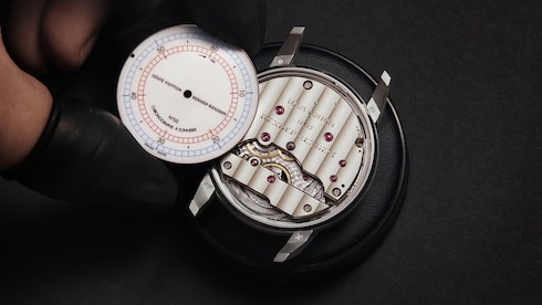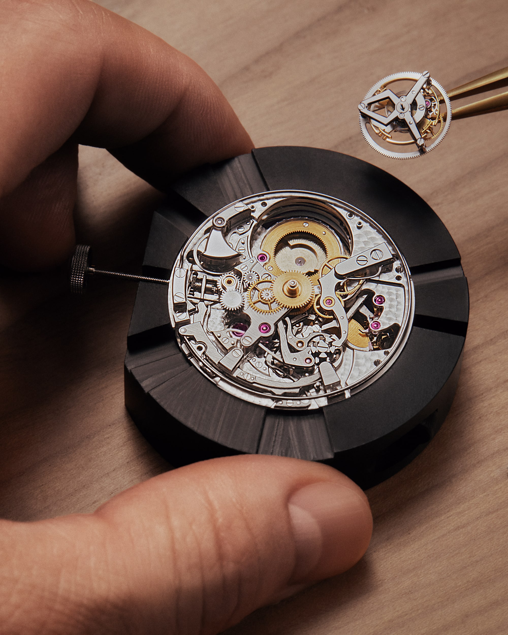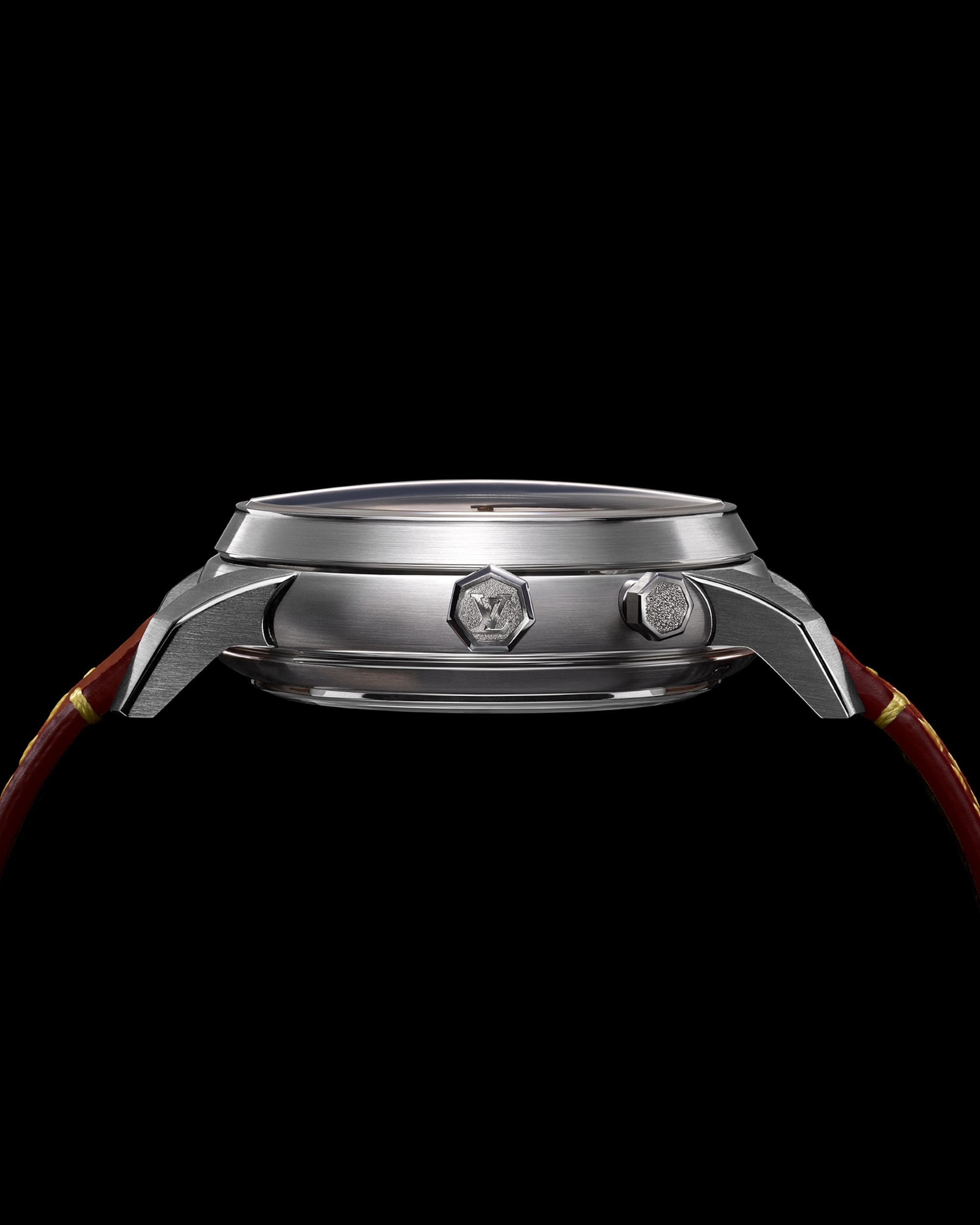 ルイ・ヴィトンとアトリエ・アクリヴィアのエスプリを受け継ぐタイムピースのプラチナケースは、ドラム(太鼓)から着想を得た、ルイ・ヴィトンを象徴するウォッチ「タンブール」の美学を彷彿させます。薄い流線型のフォルムへと再解釈されたケースはアトリエ・アクリヴィアと、そのケースメイキング工房のマスターケースメーカーであるジャン-ピエール・ハグマンが監督する工程で製造されています。