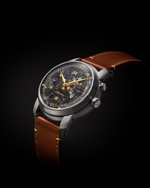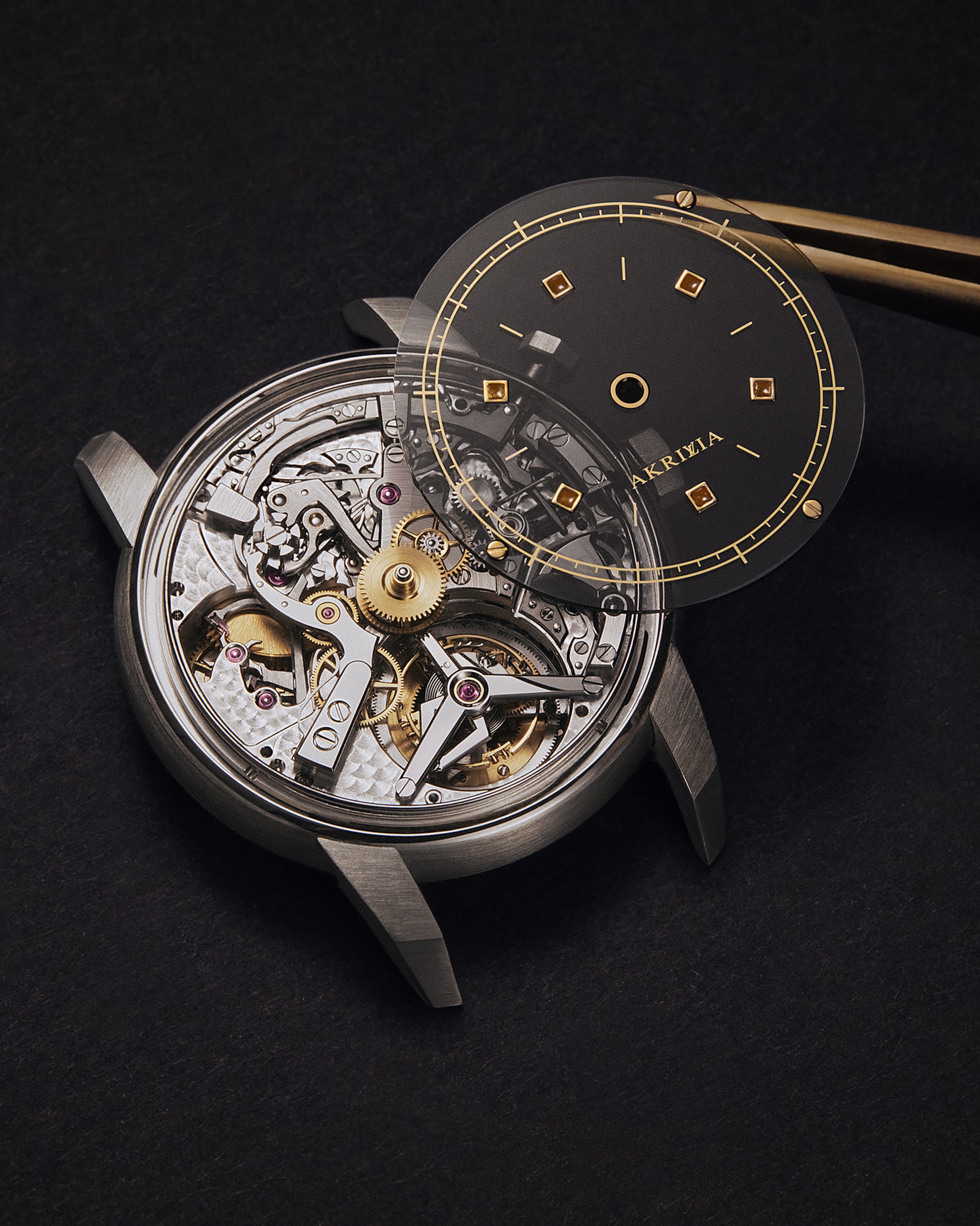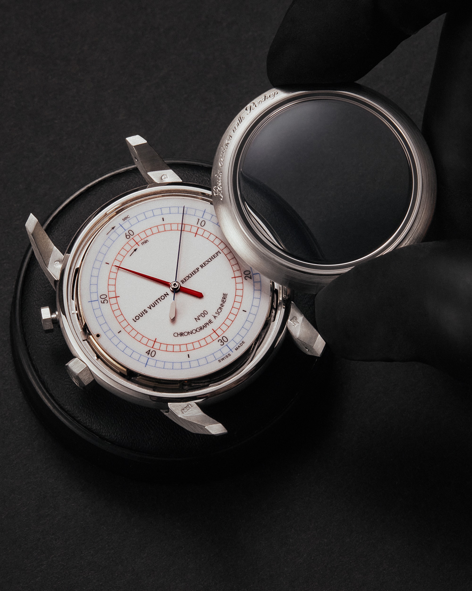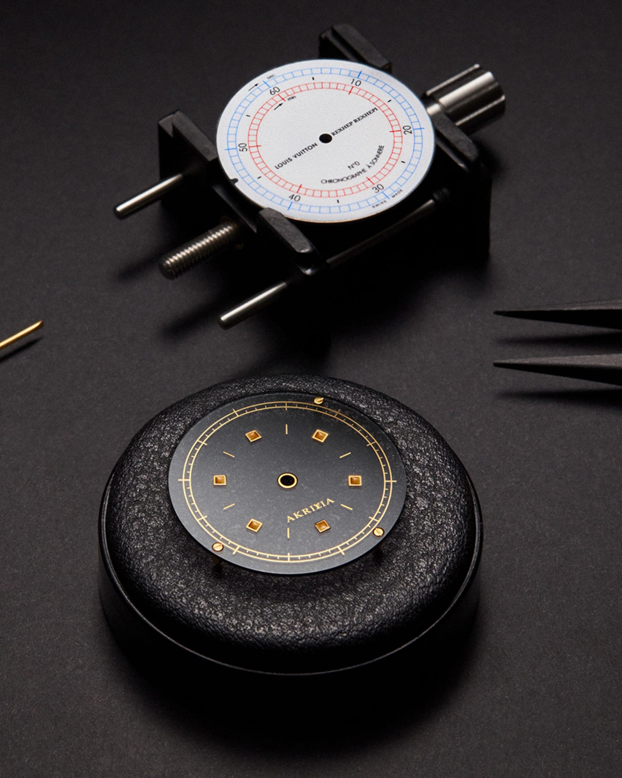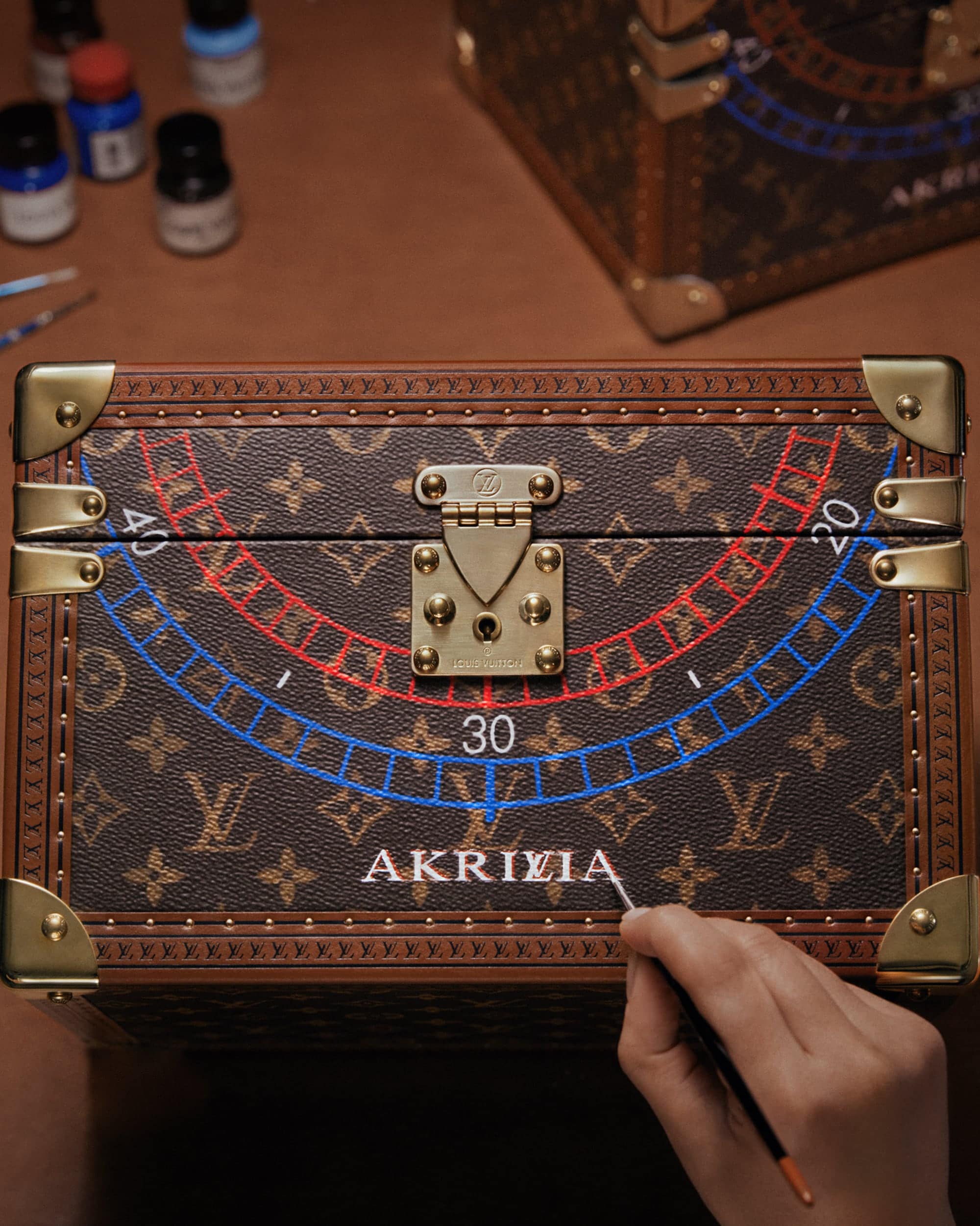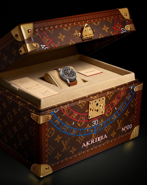 ルイ・ヴィトンの旅の伝統を彷彿させる「LVRR-01」は、エナメルダイアル上のクロノグラフの目盛りにインスパイアされたモチーフと、「AKRILVIA」のロゴ、そしてそれぞれのウォッチのシリアルナンバーが手作業で特別に描かれたトランクが付属しています。