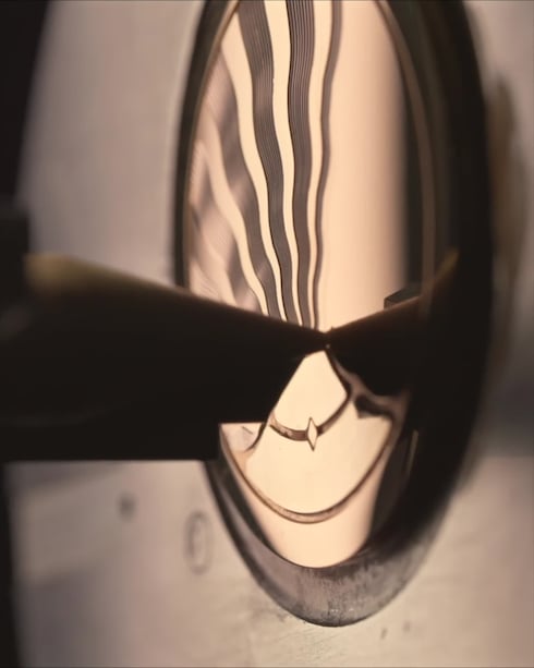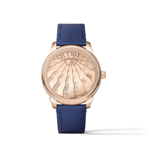 ウォッチメイキングアトリエ「ラ・ファブリク・デュ・タン ルイ・ヴィトン」で構想・製作された「タンブール コンバージェンス」は、精緻な自社製の自動巻きキャリバーを搭載。連続回転移動式の、時・分による詩的な時刻表示が特徴です。