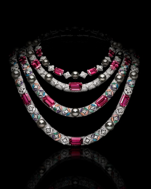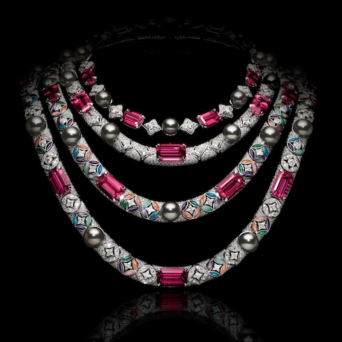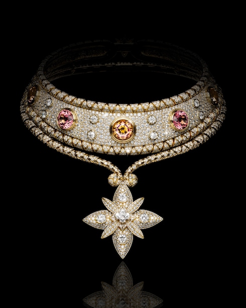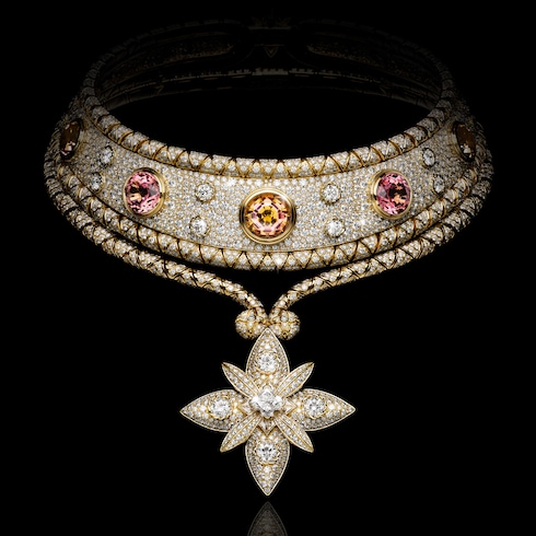 インスピレーションが予想外の可能性へと変容する様を具現化し、クリエイティビティの開花を表現した「Florescence」。大胆で鮮やかに再解釈されたモノグラム・フラワーとカイトのモチーフは、メゾンのアイコニックなコードを想わせます。2つのカラーウェイで展開するネックレスは、20石、計164.34カラットのルベライトトルマリン、または12石、計173.04カラットのインディコライトトルマリンが調和の取れたコントラストで咲き誇り、色彩とフォルムが織りなす力強くも洗練された戯れを描き出します。取り外し可能な装飾が、デザインに多様性をもたらし、動きと変容を演出します。