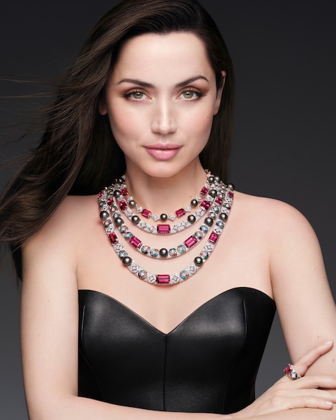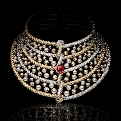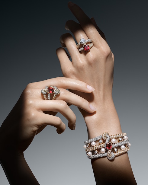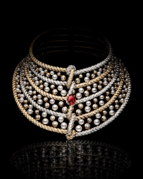 尽きることのない創造性への扉を体現する「Connection」。ここではサヴォアフェール(匠の技)は、限りない想像力と大胆な革新への道筋となります。卓越した技術を無限の可能性へと昇華させ、ダイヤモンドとパールのロープで構成される5連のステートメントネックレスは、6.04カラットのピジョンブラッドカラーのルビーによって美しさが際立ち、熟練の技と創造的な輝きとの調和を表現しています。