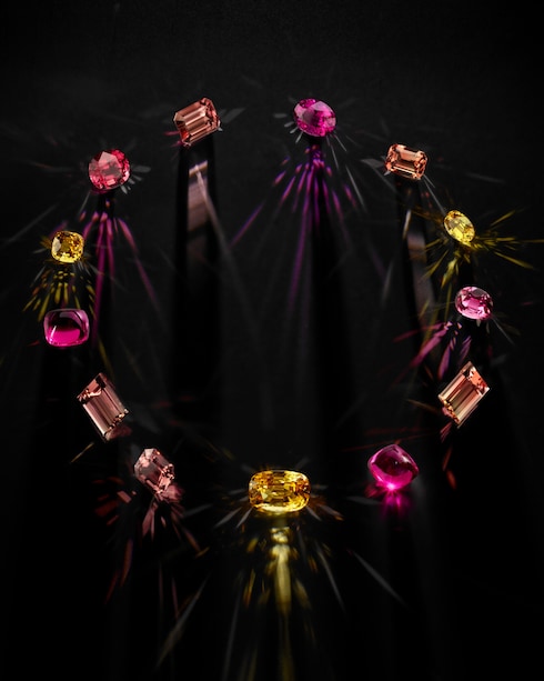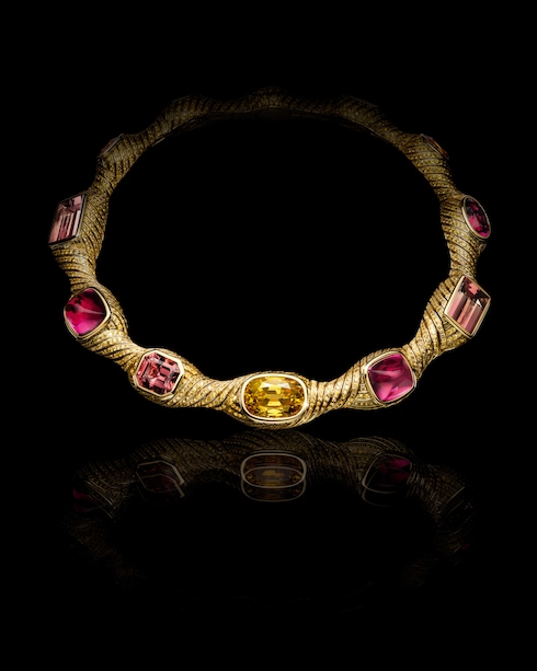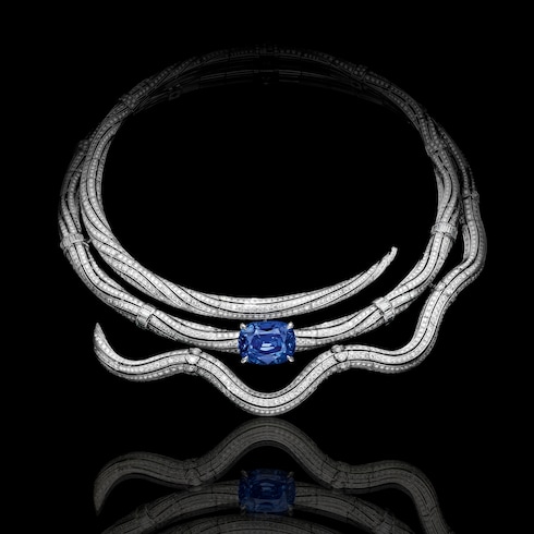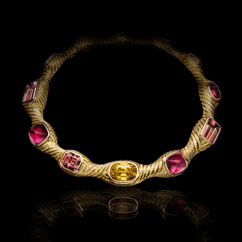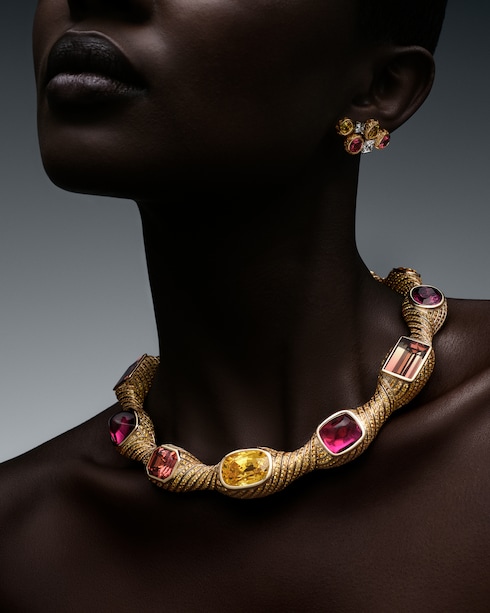 鮮烈な色彩が歓喜に満ち溢れ、いきいきとした豊かさを表現した「Joy」。創造性は力強い色彩の波へと変貌し、多様なシェイプとカットが施された40カラット超の鮮やかなサファイアや20カラット超のトルマリンなど、計204.63カラットものストーンに、ロープデザインのイエローゴールドが無限の螺旋を描きながら絡み合うダイナミックなシルエットは、自由と大胆な創造の喜びを讃えます。