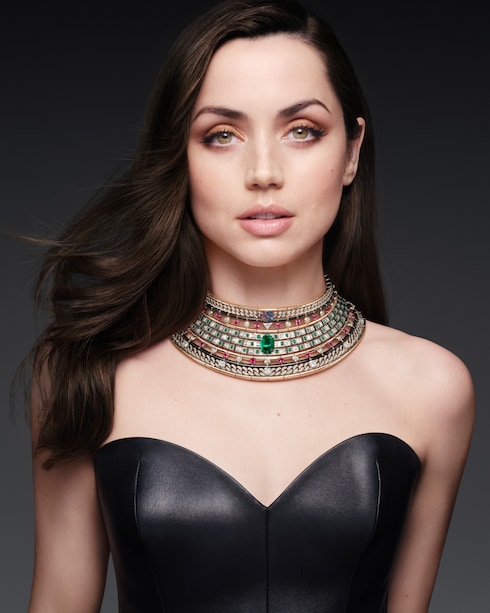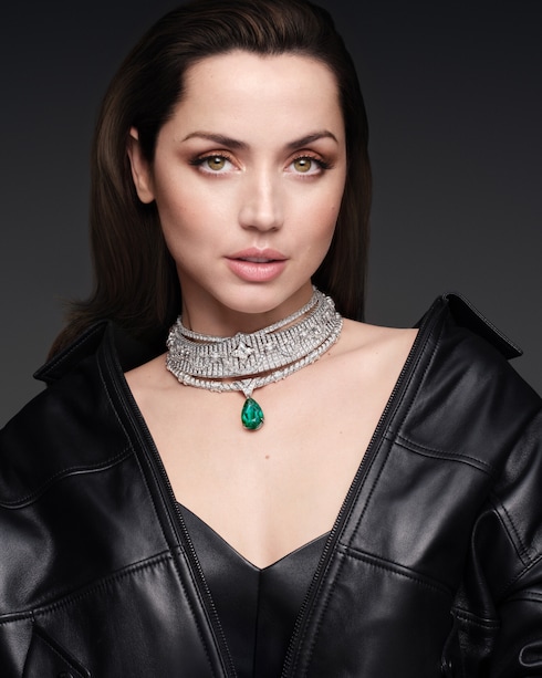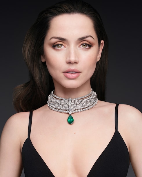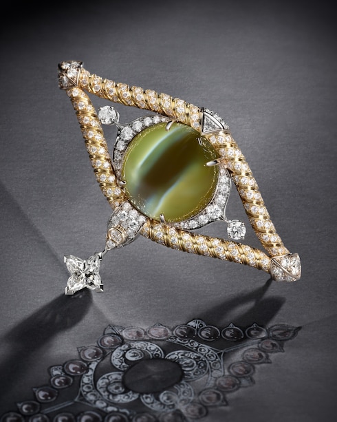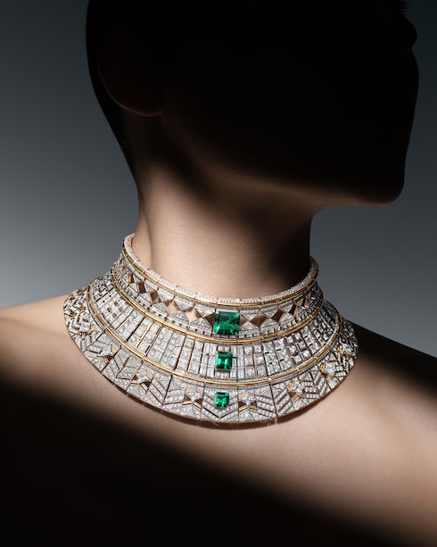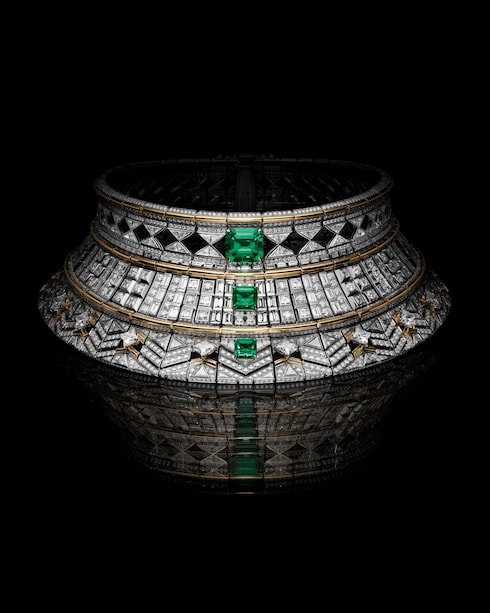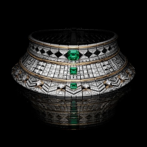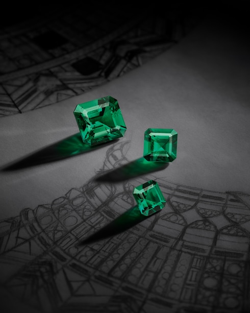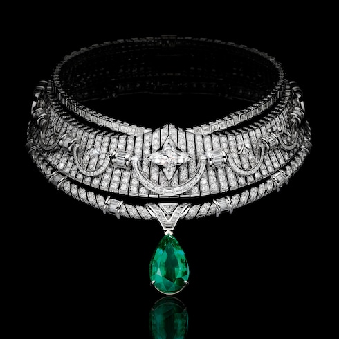 知識が展開し、正確さと制御を追求することでその秘密を明らかにする「Maestria」。精度と卓越性への道筋を描き出します。熟練の技とサヴォアフェールによって、3石のコロンビア産エメラルドを讃えた建築的な3連のフォルムを形成。その中心には稀少な8.88カラットの鮮やかなエメラルドと、ルイ・ヴィトンならではの精緻なパターンで幾何学的に配置したダイヤモンドがきらめきます。