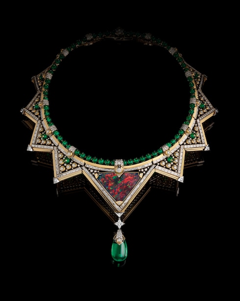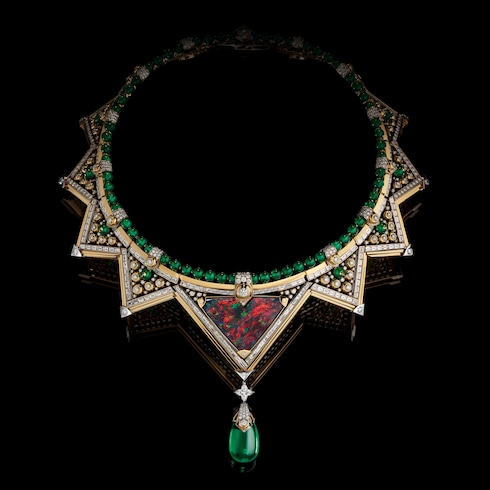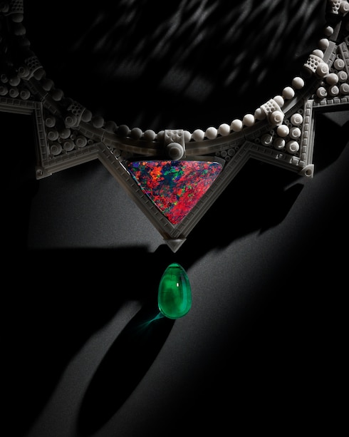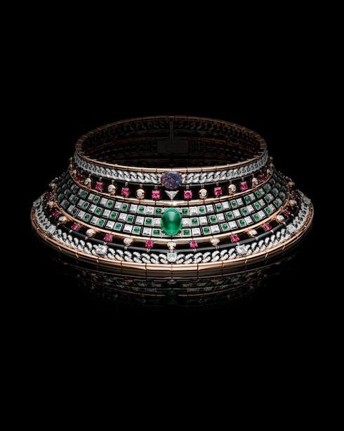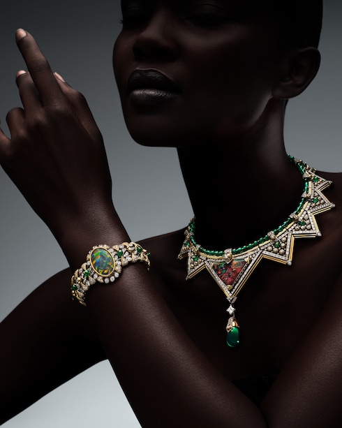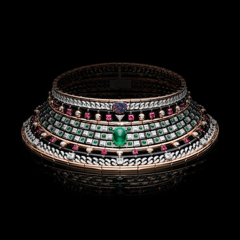 見習いから熟練の域へと昇華する過程を捉えた「Monumental」。はまばゆいばかりのカラフルな宝石を通じて、卓越性と精度への追求を象徴しています。エメラルド、ダイヤモンド、ルビー、そしてオニキスで構成された精巧なダミエ・モチーフの上に、12.84カラットのザンビア産エメラルドをあしらうことで、石を1つ1つ積み上げるような忍耐を必要とする建築の偉業における過程を複雑に映し出しています。