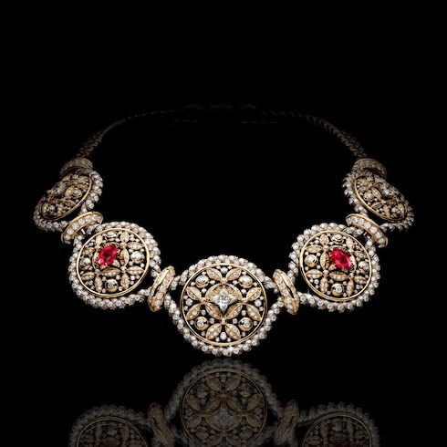 力強く、繊細でもある盾のモチーフを通して、貴重な知識を守ることの重要性を表現した「Protection」。輝くルビー、ダイヤモンド、そしてパールがその美しさを引き立てます。その綺麗な円形のフォルムは時代を超越した保護を意味し、エレガンスと象徴的な力強さを融合させた不朽の美しさを秘めています。大切に守られた貴重な叡智を表現したジュエリーです。