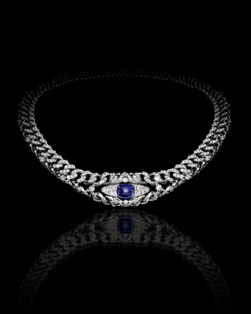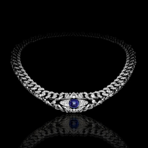すべてを見通す眼差しを持つ守護者であり、導き手でもある「Keeper」。永遠の知識を守り続ける眼差しを具現化した、繊細で神秘的なコレクションの主役となるのは、10.12カラットのスリランカ産ブルーサファイアがセットされたユニセックスなネックレス。アイコニックな「V」シェイプのダイヤモンドのトライアングルとトランクから着想を得たディテールが際立ちます。